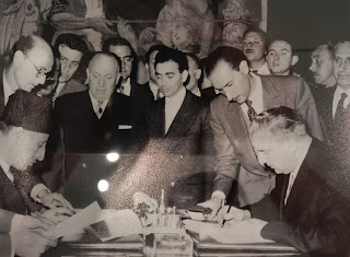 la firma del nuevo Estado de Marruecos por parte del primer ministro marroquí, Sidi Embarek El Bekkai y el ministro español de Asuntos Exteriores Alberto Martín Artajo, en el Palacio del Pardo, el 7 de abril de 1956,